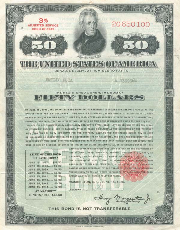 U.S. Treasury Bond. "3% Adjusted Service Bond of 1945".
